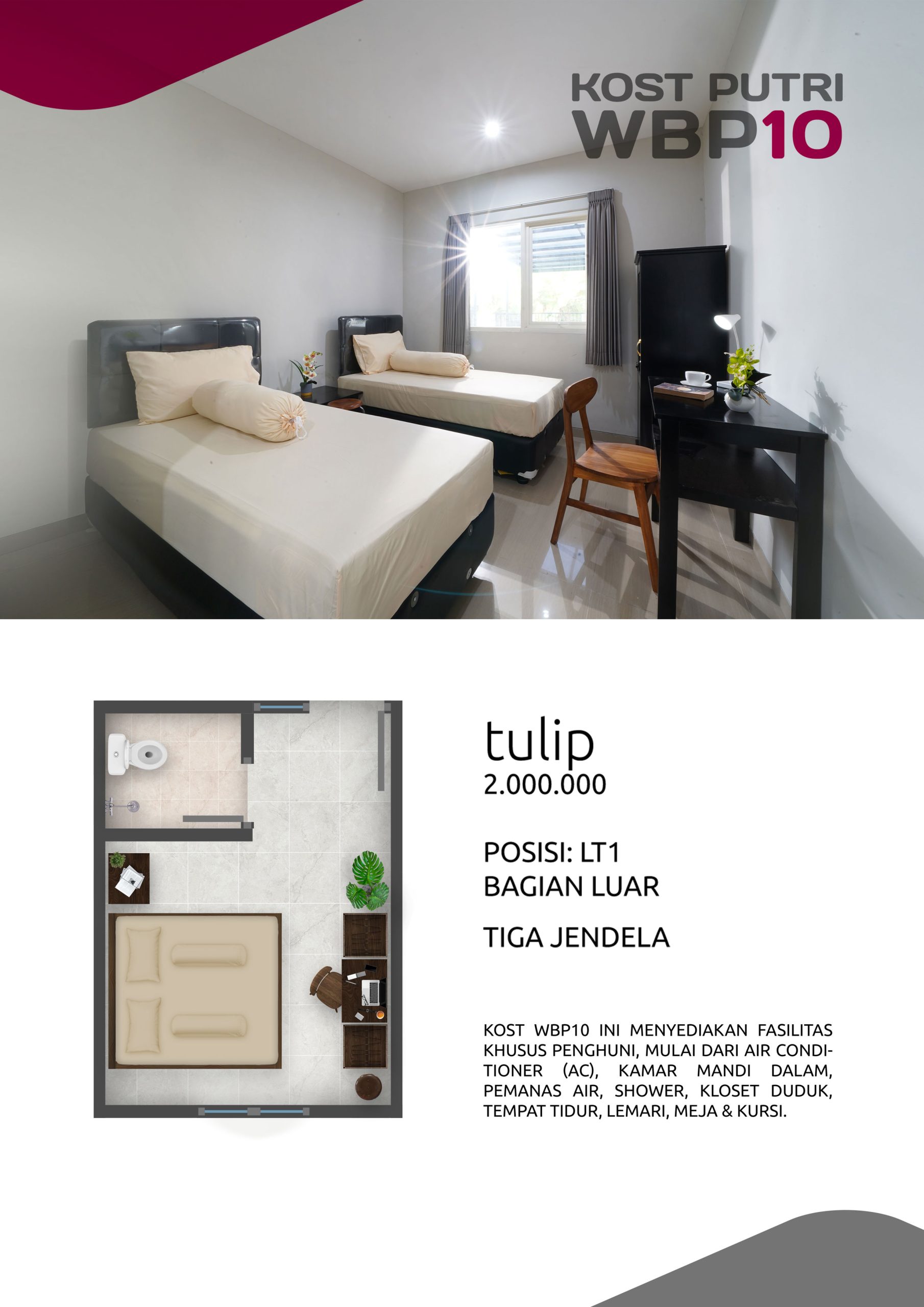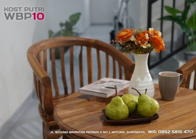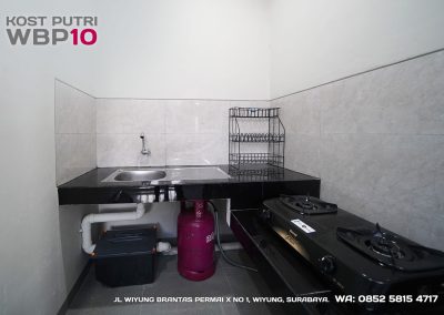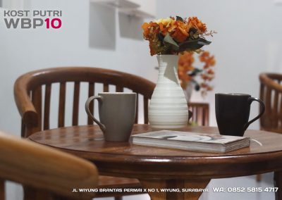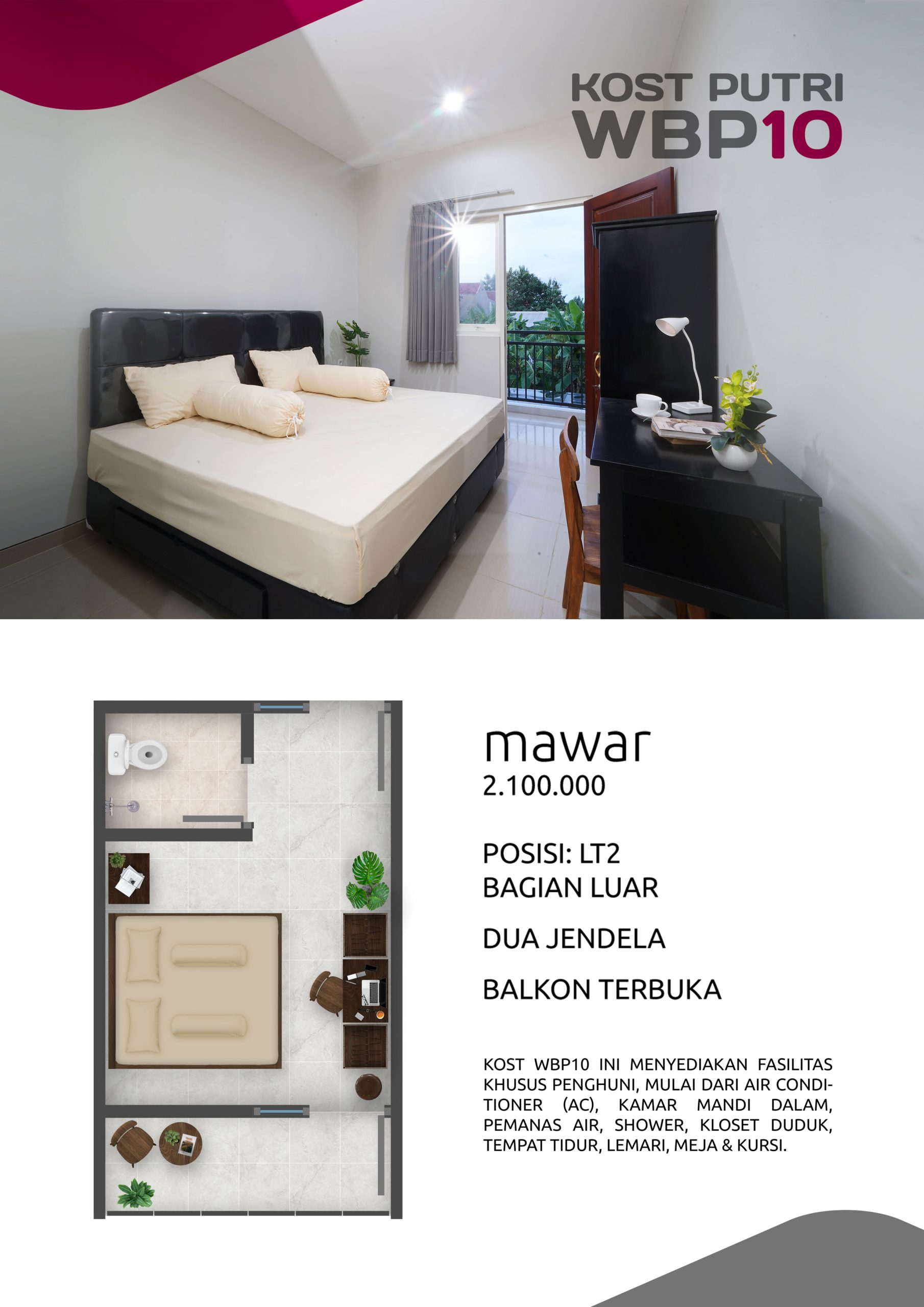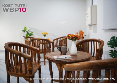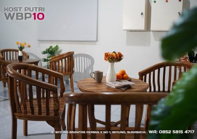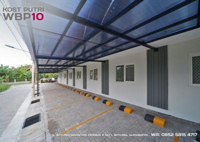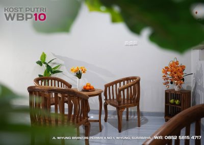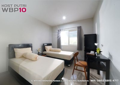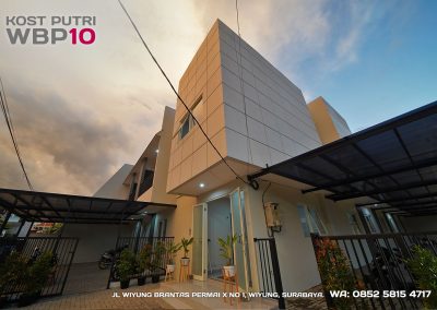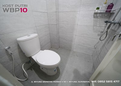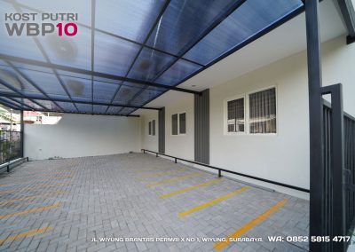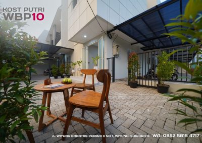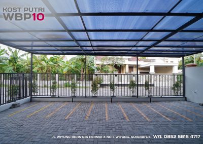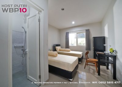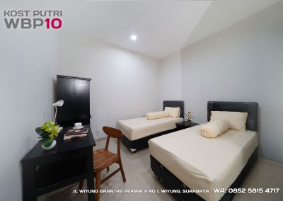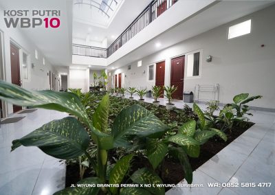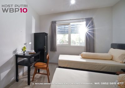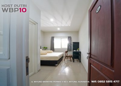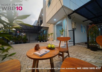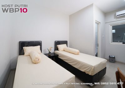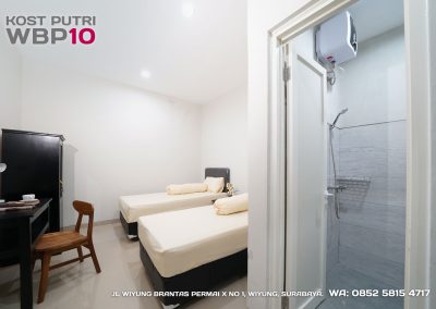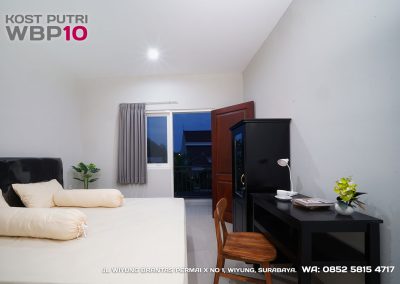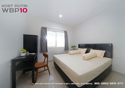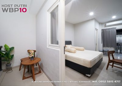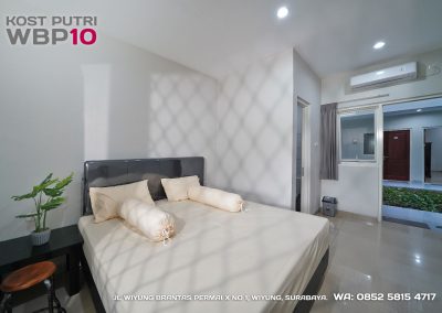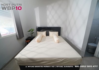 Kost Putri ini menyediakan fasilitas khusus penghuni, mulai dari air conditioner, kamar mandi dalam, pemanas air, shower, kloset duduk, tempat tidur, lemari, meja & kursi. Dengan kamar berukuran 3.5x5m, WBP10 memiliki fasilitas umum yang lengkap seperti wifi, ruang tamu, taman indoor, dapur, area cuci serta parkiran mobil & motor.