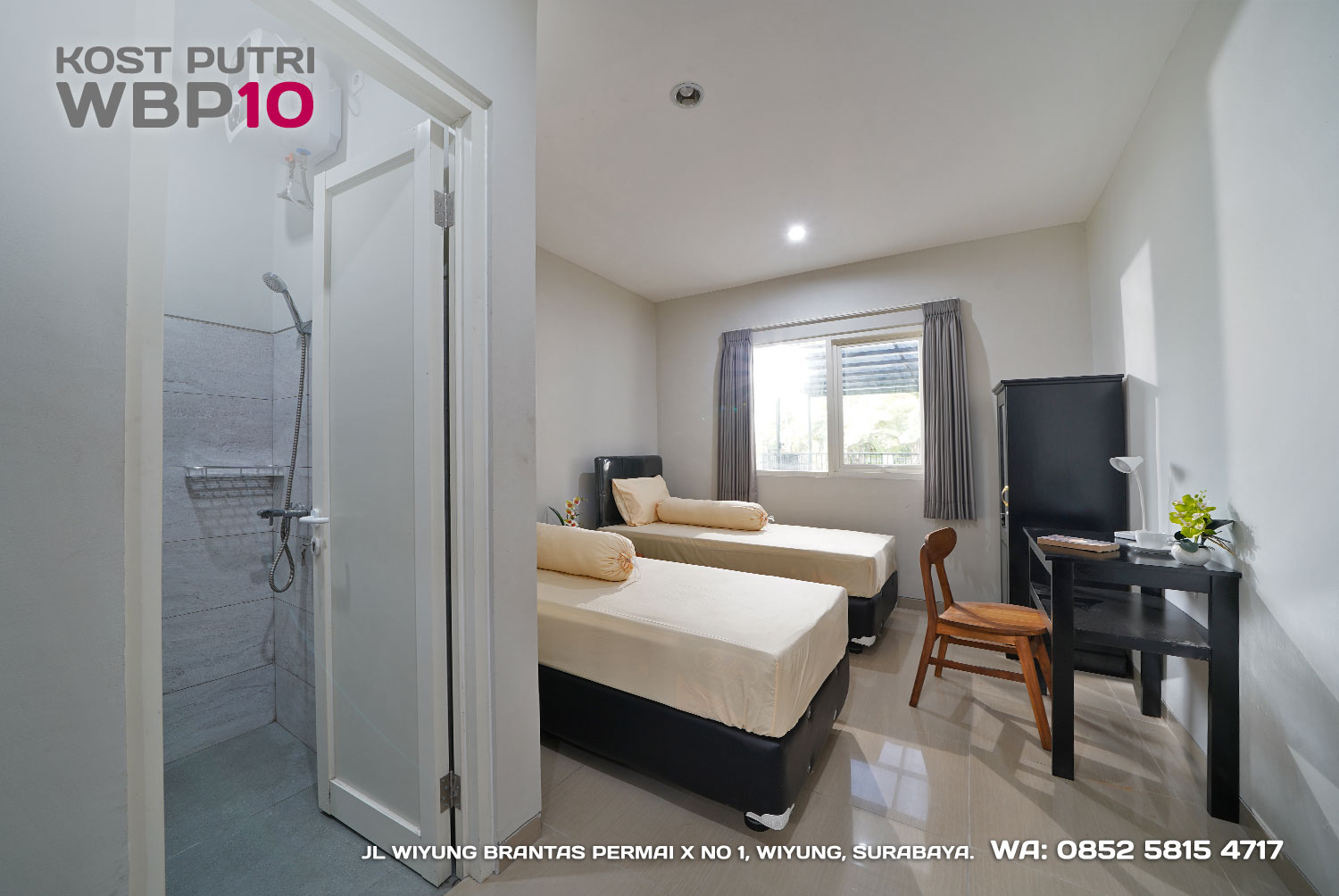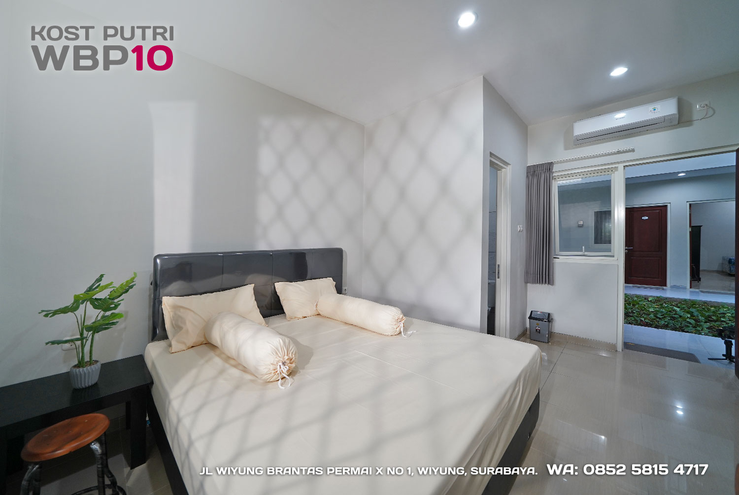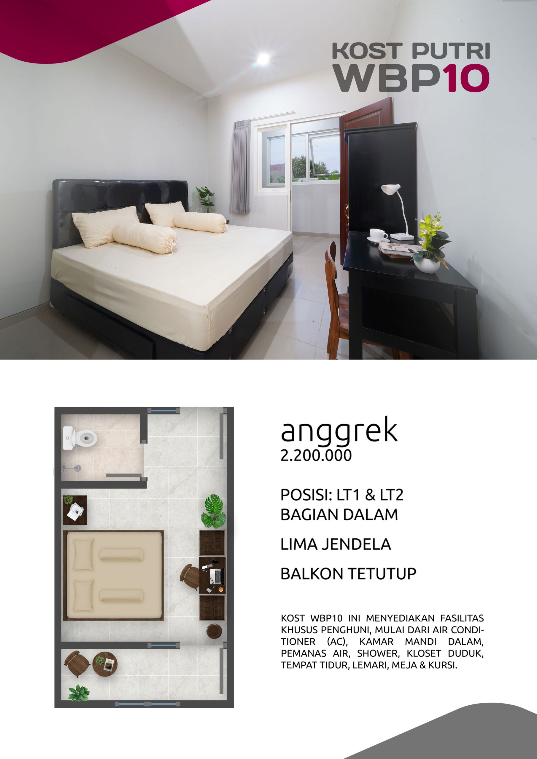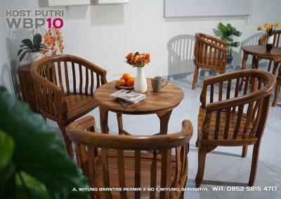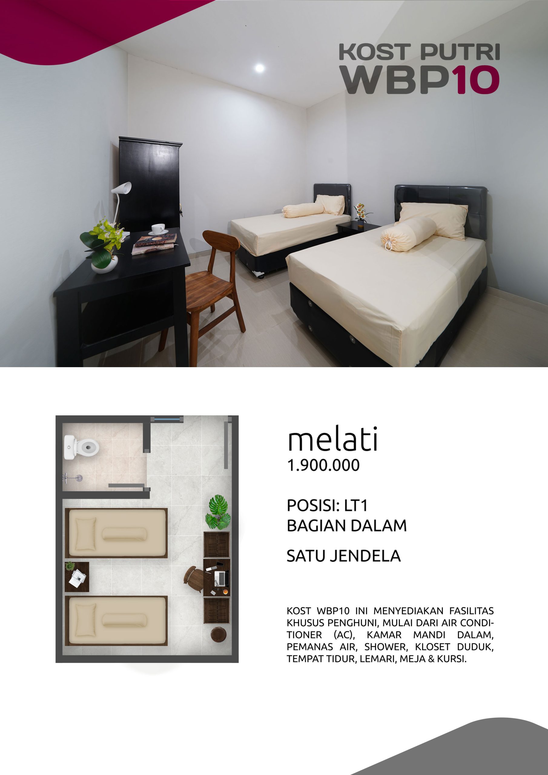 Kost Putri ini menyediakan fasilitas khusus penghuni, mulai dari air conditioner, kamar mandi dalam, pemanas air, shower, kloset duduk, tempat tidur, lemari, meja & kursi. Dengan kamar berukuran 3.5x5m, WBP10 memiliki fasilitas umum yang lengkap seperti wifi, ruang tamu, taman indoor, dapur, area cuci serta parkiran mobil & motor.