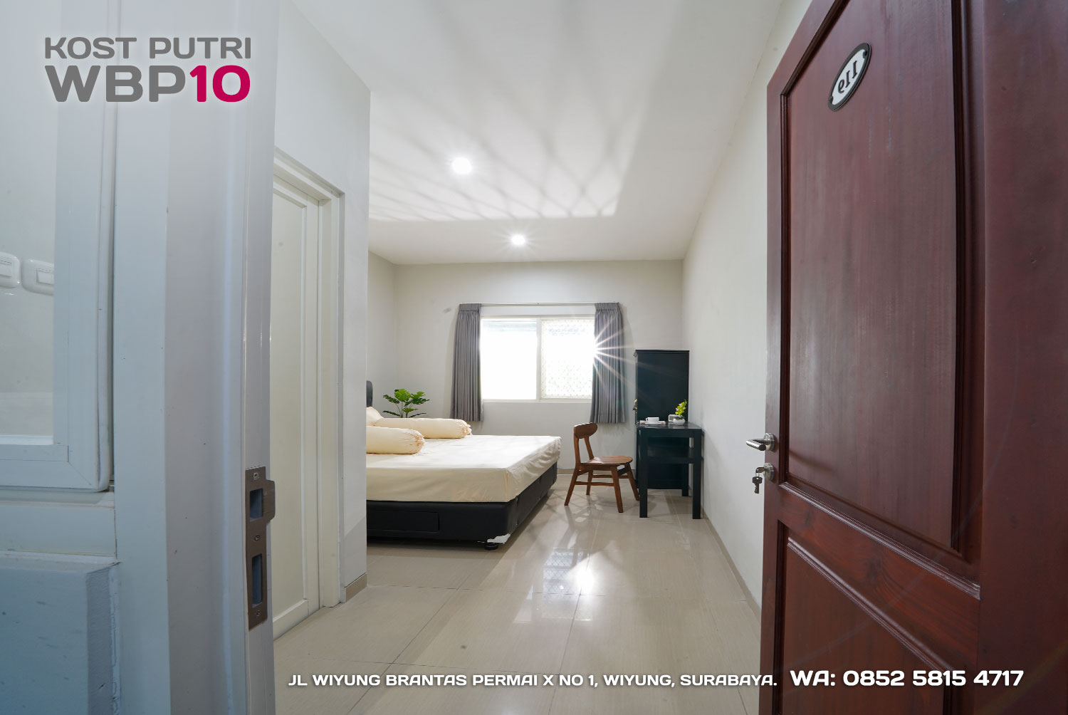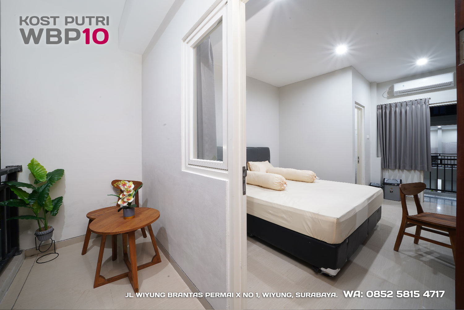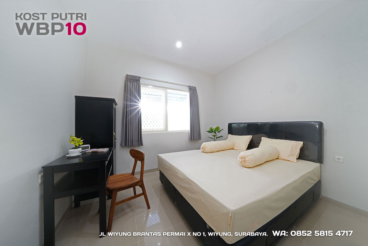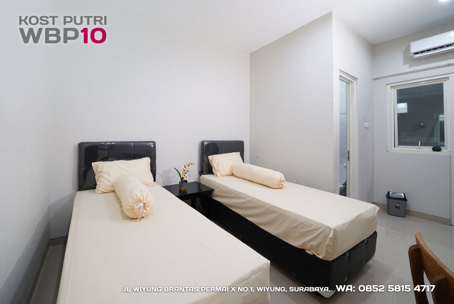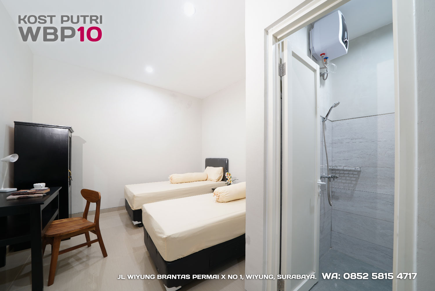 Kost Putri ini menyediakan fasilitas khusus penghuni, mulai dari air conditioner, kamar mandi dalam, pemanas air, shower, kloset duduk, tempat tidur, lemari, meja & kursi. Dengan kamar berukuran 3.5x5m, WBP10 memiliki fasilitas umum yang lengkap seperti wifi, ruang tamu, taman indoor, dapur, area cuci serta parkiran mobil & motor.